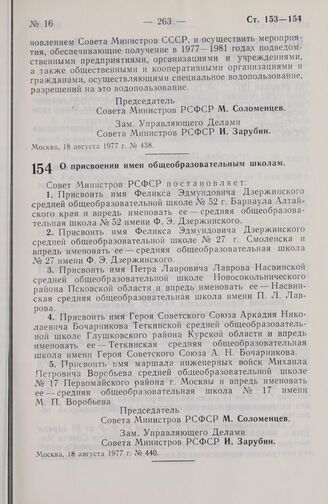 Постановление Совета Министров РСФСР. О присвоении имен общеобразовательным школам. 18 августа 1977 г. № 440