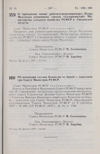 Постановление Совета Министров РСФСР. Об изменении состава комиссии по борьбе с пьянством при Совете Министров РСФСР. 30 августа 1977 г. № 461