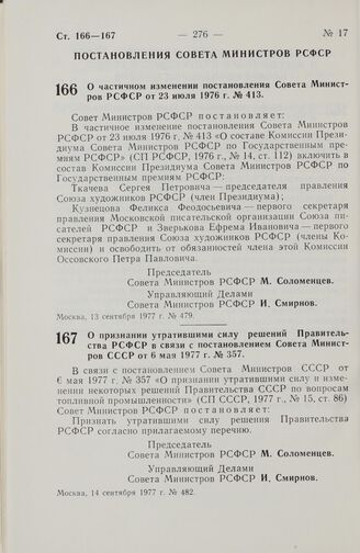 Постановление Совета Министров РСФСР. О признании утратившими силу решений Правительства РСФСР в связи с постановлением Совета Министров СССР от 6 мая 1977 г. № 357. 14 сентября 1977 г. № 482
