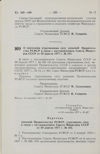 Постановление Совета Министров РСФСР. О признании утратившими силу решений Правительства РСФСР в связи с постановлением Совета Министров СССР от 29 апреля 1977 г. № 343. 16 сентября 1977 г. № 487