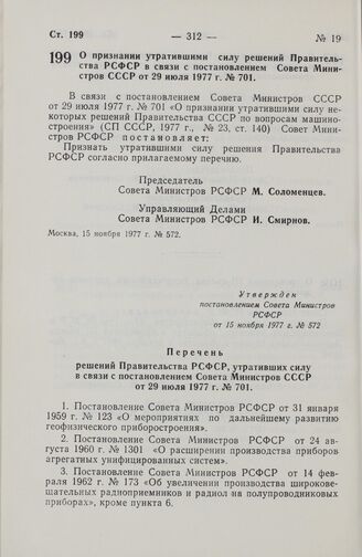 Постановление Совета Министров РСФСР. О признании утратившими силу решений Правительства РСФСР в связи с постановлением Совета Министров СССР от 29 июля 1977 г. № 701. 15 ноября 1977 г. № 572