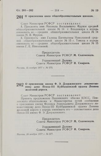Постановление Совета Министров РСФСР. О присвоении имен общеобразовательным школам. 15 ноября 1977 г. № 575