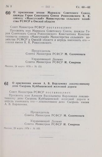 Постановление Совета Министров РСФСР. О присвоении имени А.В. Варламова локомотивному депо Сызрань Куйбышевской железной дороги. 29 марта 1978 г. № 160