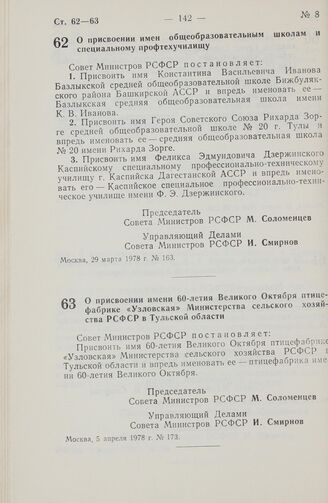 Постановление Совета Министров РСФСР. О присвоении имен общеобразовательным школам и специальному профтехучилищу. 29 марта 1978 г. № 163