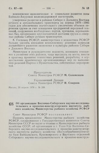 Постановление Совета Министров РСФСР. Об организации Восточно-Сибирского научно-исследовательского и проектно-конструкторского института рыбного хозяйства Министерства рыбного хозяйства РСФСР. 14 апреля 1978 г. № 187