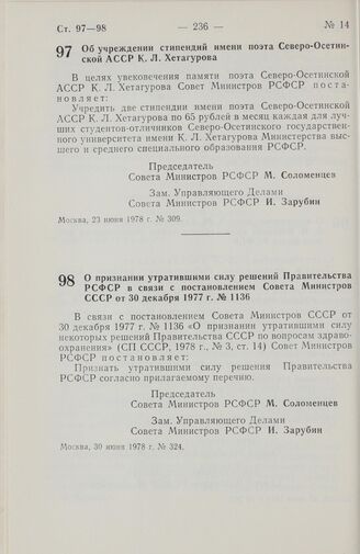 Главная Собрание законов и распоряжений правительства РСФСР и СССР Собрание законов и распоряжений Рабоче-Крестьянского Правительства ... Собрание постановлений правительства РСФСР за 1978 г. № 1-23 Документы Постановление Совета Министров РСФСР. О признании утратившими силу ...