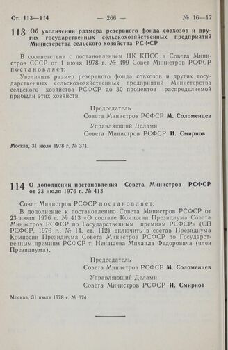 Постановление Совета Министров РСФСР. О дополнении постановления Совета Министров РСФСР от 23 июля 1976 г. № 413. 31 июля 1978 г. № 374