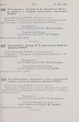 Постановление Совета Министров РСФСР. О назначении т. Калинина Э.К. заместителем Министра высшего и среднего специального образования РСФСР. 2 августа 1978 г. № 381