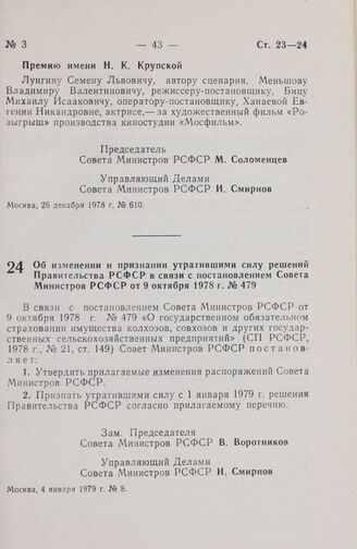Постановление Совета Министров РСФСР. Об изменении и признании утратившими силу решений Правительства РСФСР в связи с постановлением Совета Министров РСФСР от 9 октября 1978 г. № 479. 4 января 1979 г. № 8