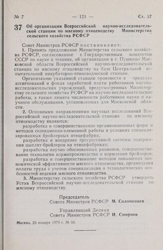 Постановление Совета Министров РСФСР. Об организации Всероссийской научно-исследовательской станции по мясному птицеводству Министерства сельского хозяйства РСФСР. 23 января 1979 г. № 56