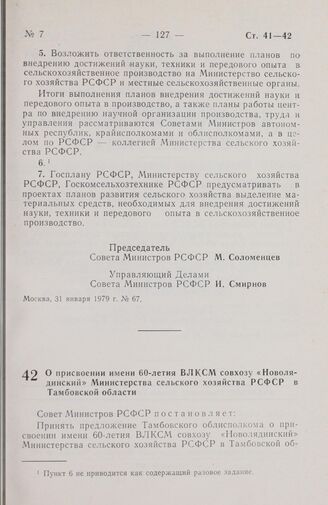 Постановление Совета Министров РСФСР. О присвоении имени 60-летия ВЛКСМ совхозу «Новолядинский» Министерства сельского хозяйства РСФСР в Тамбовской области. 2 февраля 1979 г. № 73