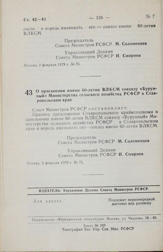 Постановление Совета Министров РСФСР. О присвоении имени 60-летия ВЛКСМ совхозу «Бурунный» Министерства сельского хозяйства РСФСР в Ставропольском крае. 2 февраля 1979 г. № 75