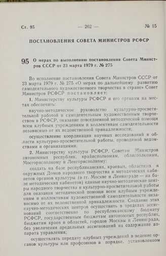 Постановление Совета Министров РСФСР. О мерах по выполнению постановления Совета Министров СССР от 23 марта 1979 г. № 275. 14 мая 1979 г. № 260