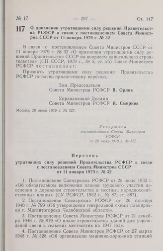 Постановление Совета Министров РСФСР. О признании утратившими силу решений Правительства РСФСР в связи с постановлением Совета Министров СССР от 11 января 1979 г. № 32. 20 июня 1979 г. № 327