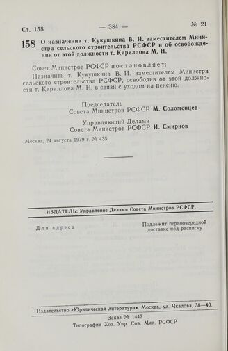 Постановление Совета Министров РСФСР. О назначении т. Кукушкина В.И. заместителем Министра сельского строительства РСФСР и об освобождении от этой должности т. Кириллова М.Н. 24 августа 1979 г. № 435