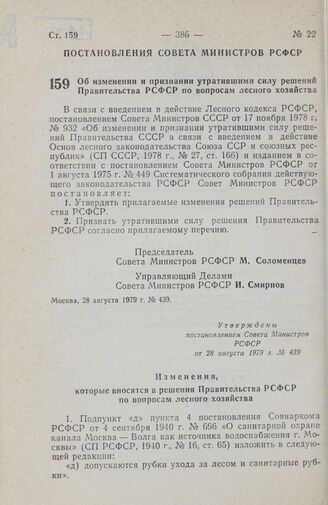 Постановление Совета Министров РСФСР. Об изменении и признании утратившими силу решений Правительства РСФСР по вопросам лесного хозяйства. 28 августа 1979 г. № 439