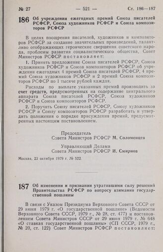 Постановление Совета Министров РСФСР. Об изменении и признании утратившими силу решений Правительства РСФСР по вопросу взимания государственной пошлины. 23 октября 1979 г. № 521