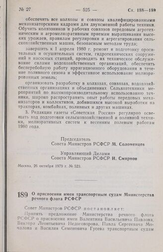 Постановление Совета Министров РСФСР. О присвоении имен транспортным судам Министерства речного флота РСФСР. 26 октября 1979 г. № 526
