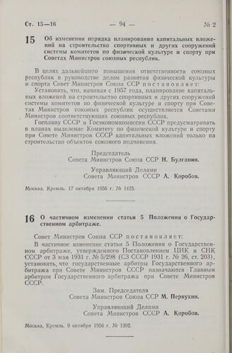 Постановление Совета Министров СССР. О частичном изменении статьи 5 Положения о Государственном арбитраже. 9 октября 1956 г. № 1392