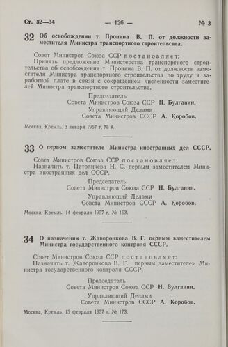 Постановление Совета Министров СССР. О назначении т. Жаворонкова В.Г. первым заместителем Министра государственного контроля СССР. 15 февраля 1957 г. № 173