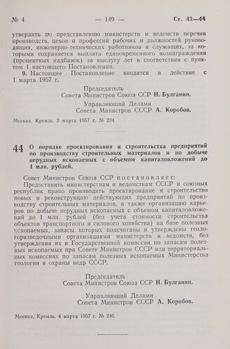 Постановление Совета Министров СССР. О порядке проектирования и строительства предприятий по производству строительных материалов и по добыче нерудных ископаемых с объемом капиталовложений до 1 млн. рублей. 4 марта 1957 г. № 246