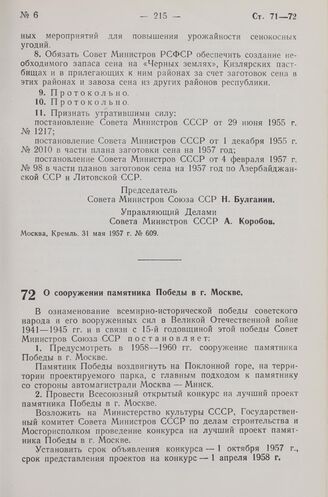 Постановление Совета Министров СССР. О сооружении памятника Победы в г. Москве. 31 мая 1957 г. № 636