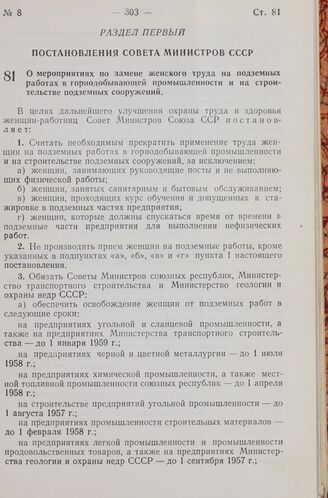 Постановление Совета Министров СССР. О мероприятиях по замене женского труда на подземных работах в горнодобывающей промышленности и на строительстве подземных сооружений. 13 июля 1957 г. № 839