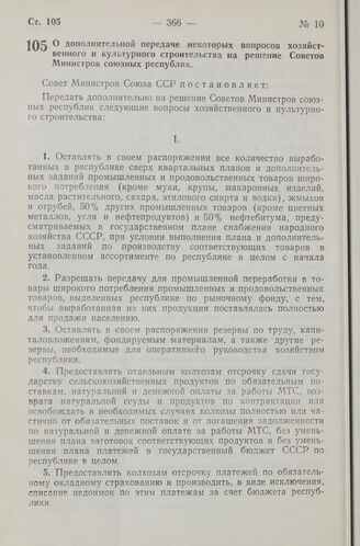 Постановление Совета Министров СССР. О дополнительной передаче некоторых вопросов хозяйственного и культурного строительства на решение Советов Министров союзных республик. 29 августа 1957 г. № 1041