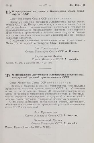 Постановление Совета Министров СССР. О прекращении деятельности Министерства черной металлургии СССР. 6 сентября 1957 г. № 1079