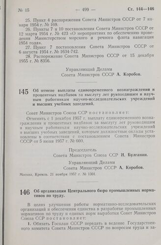Постановление Совета Министров СССР. Об организации Центрального бюро промышленных нормативов по труду. 30 ноября 1957 г. № 1316