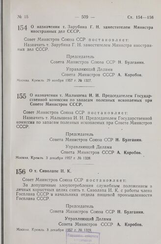 Постановление Совета Министров СССР. О назначении т. Зарубина Г.Н. заместителем Министра иностранных дел СССР. 29 ноября 1957 г. № 1327
