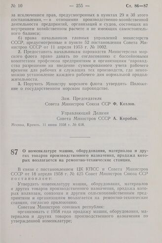 Главная Собрание законов и распоряжений правительства РСФСР и СССР Собрание законов и распоряжений Рабоче-Крестьянского Правительства ... Собрание постановлений правительства СССР за 1958 г. № 1-20 Документы Постановление Совета Министров СССР. О номенклатуре машин, оборудов...