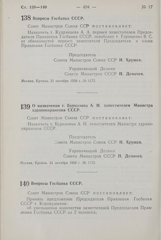 Постановление Совета Министров СССР. О назначении т. Бурназяна А.И. заместителем Министра здравоохранения СССР. 21 октября 1958 г. № 1173
