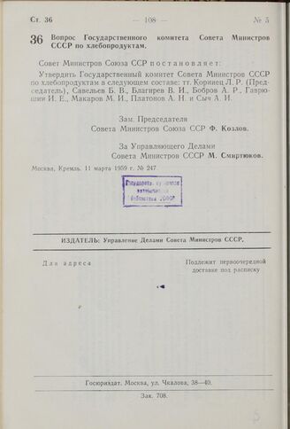 Постановление Совета Министров СССР. Вопрос Государственного комитета Совета Министров СССР по хлебопродуктам. 11 марта 1959 г. № 247