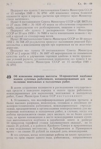 Постановление Совета Министров СССР. Об изменении порядка выплаты 50-процентной надбавки взамен суточных работникам, командированным для выполнения монтажных и наладочных работ. 20 апреля 1959 г. № 423