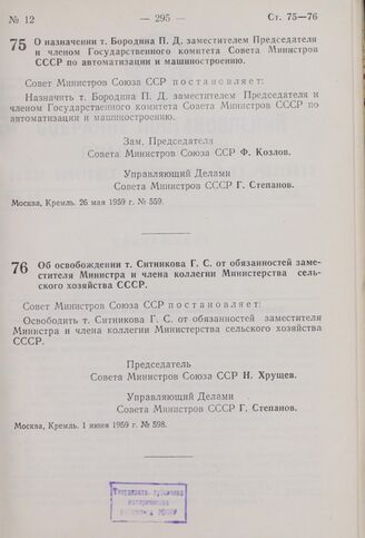 Постановление Совета Министров СССР. О назначении т. Бородина П.Д. заместителем Председателя и членом Государственного комитета Совета Министров СССР по автоматизации и машиностроению. 26 мая 1959 г. № 559