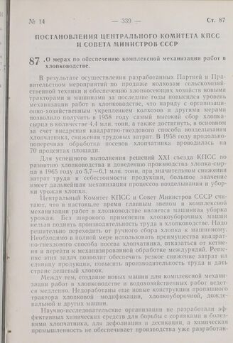 Постановление Центрального Комитета КПСС и Совета Министров СССР. О мерах по обеспечению комплексной механизации работ в хлопководстве. 2 июля 1959 г. № 708