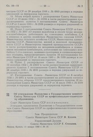 Постановление Совета Министров СССР. Об утверждении Положения о Государственном комитете Совета Министров СССР по профессионально-техническому образованию. 11 января 1960 г. № 19