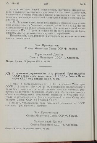 Постановление Совета Министров СССР. О признании утратившими силу решений Правительства СССР в связи с постановлением ЦК КПСС и Совета Министров СССР от 2 января 1959 г. № 24. 24 февраля 1960 г. № 215