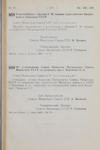 Постановление Совета Министров СССР. О назначении т. Орлова Г. М. первым заместителем Председателя Госплана СССР. 20 июля 1960 г. № 754
