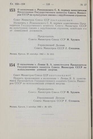 Постановление Совета Министров СССР. О назначении т. Левши В. А. заместителем Председателя Государственного комитета Совета Министров СССР по использованию атомной энергии. 5 октября 1960 г. № 1073