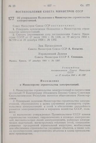Постановление Совета Министров СССР. Об утверждении Положения о Министерстве строительства электростанций. 17 декабря 1960 г. № 1287