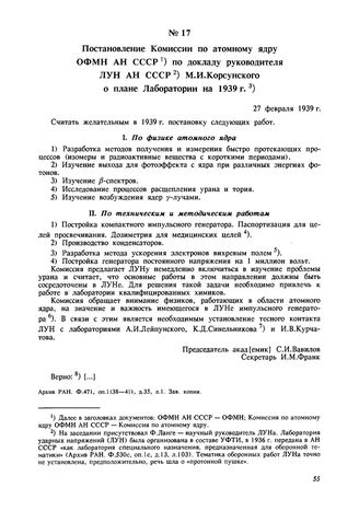 Постановление Комиссии по атомному ядру ОФМН АН СССР по докладу руководителя ЛУН АН СССР М.И. Корсунского о плане Лаборатории на 1939 г. 27 февраля 1939 г.