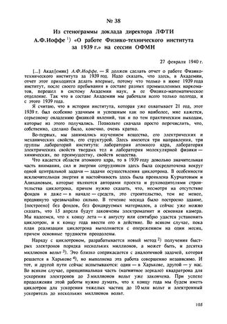 Из стенограммы доклада директора ЛФТИ А.Ф. Иоффе «О работе Физико-технического института за 1939 г.» на сессии ОФМН. 27 февраля 1940 г. // Архив РАН. Ф. 471, оп. 1, д. 63, л. 33-34об. Незаверенная копия.