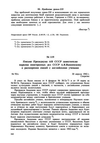 Письмо Президиума АН СССР заместителю наркома иностранных дел СССР А.Я. Вышинскому о расширении связей с английскими учеными. № 701с. 20 апреля 1942 г. // Архив РАН. Ф.530с, оп. 1c, д. 215, л. 9-10. Отпуск.