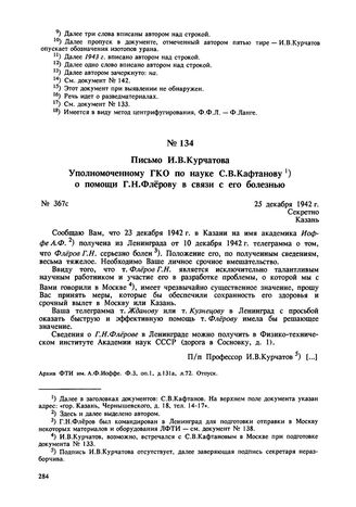 Письмо И.В. Курчатова Уполномоченному ГКО по науке С.В. Кафтанову о помощи Г.Н. Флерову в связи с его болезнью. № 367с. 25 декабря 1942 г.