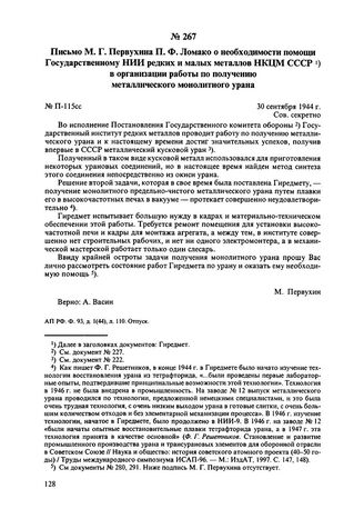 Письмо М.Г. Первухина П.Ф. Ломако о необходимости помощи Государственному НИИ редких и малых металлов НКЦМ СССР в организации работы по получению металлического монолитного урана. № П-115сс. 30 сентября 1944 г. // АП РФ. Ф. 93, д. 1(44), л. 110. Отпуск.