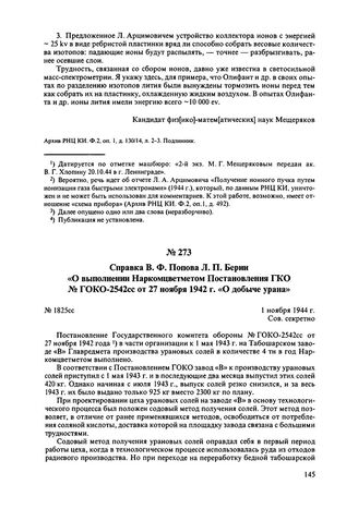 Справка В.Ф. Попова Л.П. Берии «О выполнении Наркомцветметом Постановления ГКО № ГОКО-2542сс от 27 ноября 1942 г. «О добыче урана». № 1825сс. 1 ноября 1944 г. // АП РФ. Ф. 93, д. 46(45), л. 1-3. Подлинник.