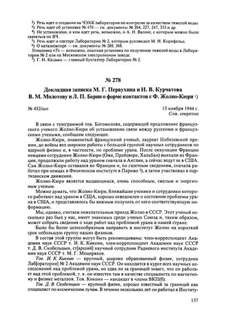 Докладная записка М.Г. Первухина и И.В. Курчатова В.М. Молотову и Л.П. Берии о форме контактов с Ф. Жолио-Кюри. № 432/шо. 13 ноября 1944 г.