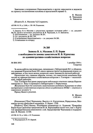 Записка В.А. Махнева Л.П. Берии о необходимости замены заместителя И.В. Курчатова по административно-хозяйственным вопросам. № ВМ-3892. 1 декабря 1944 г.
